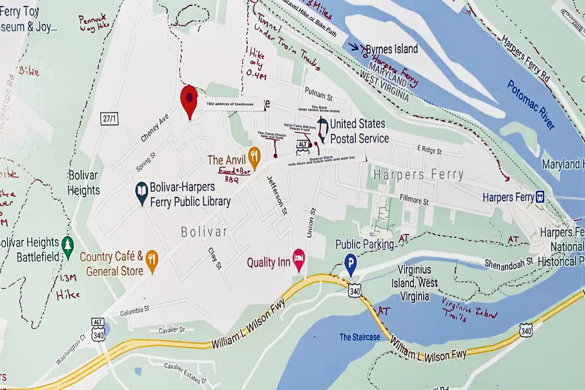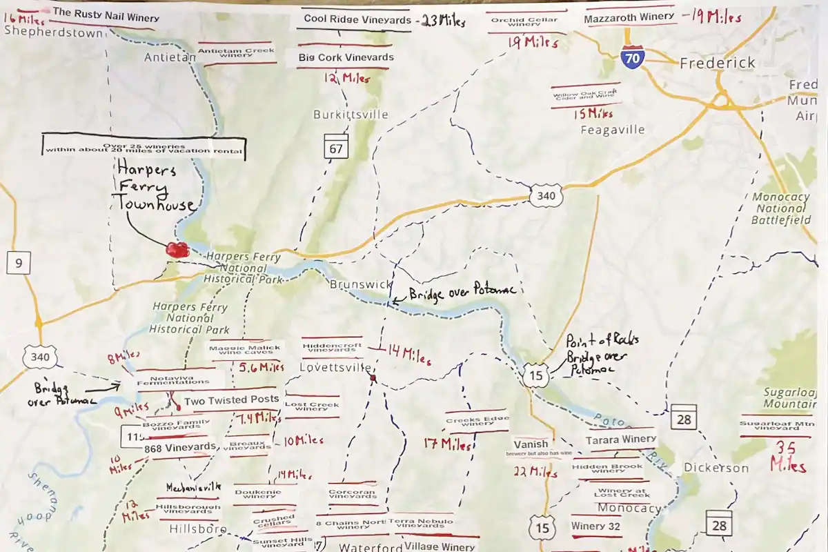 See for yourself why Thomas Jefferson called this picturesque landscape ""perhaps one of the most stupendous scenes in nature.". There is always something going on in HF, be it a Civil War re-enactment or filming for upcoming film and documentaries (e.g. The Good Lord Bird on Showtime about John Brown, or Emperor, The Raid at Harpers Ferry 2020.). The Townhouse itself rests in a peaceful neighborhood a quarter mile walk to Washington Street, the main drag that leads down into the Old Town Harpers Ferry. Washington Street has all the great restaurants, bars and occasional live music at the Anvil and the Barn, all within a quarter mile of the Townhouse. New: walk to the Wine Bar at the General Store on Washington St. with Weekend wine tastings of mostly international wines, also wine for sale. This guy is very knowledgeable about his wines. Walk over the hill behind the neighborhood to find the Potomac at the bottom. Tons of hiking trails just outside the front door to Bolivar Heights, or slightly longer hike to more famous hiking trails like the AT, Loudon Lookout Heights or Maryland Heights. Need a launch pad for visiting wineries and breweries? The TH is central to over 30 wineries and 10 breweries within 25 miles. Please don't drink and drive, you can take an Uber from here.